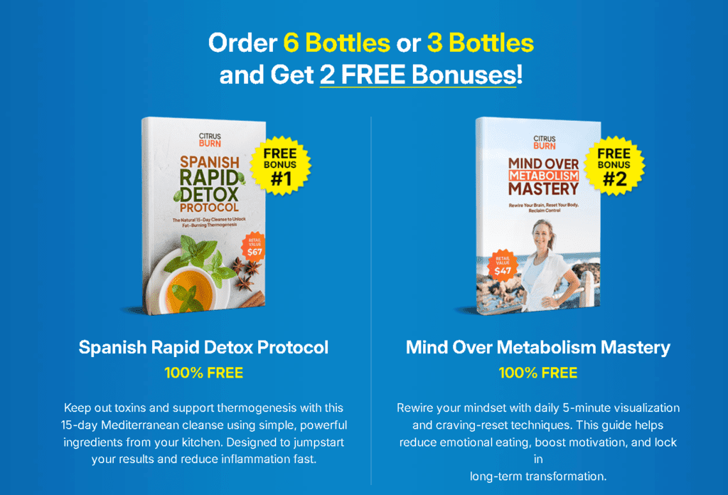 When you commit to the 3-bottle or 6-bottle packages, CitrusBurn includes two high-value digital bonuses designed to accelerate your transformation: